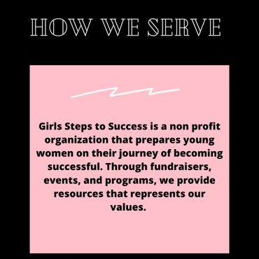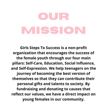 Girls Steps To Success is a non-profit organization that encourages the success of the female youth through our four main pillars: Self-Care, Education, Social Influence, and Self-Expression. We help teenagers on the journey of becoming the best version of themselves so that they can contribute their personal gifts and talents to society. By fundraising and donating to causes that reflect our values, we have a direct impact on young females in our community.